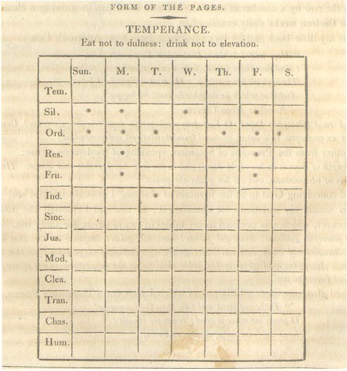 Here’s an image of the chart that Franklin would carry with him (note that it contains only ONE of the virtues–he suggested focusing on each one for a week at a time, not at the expense of the others, but to really fix his mind and heart on the importance of that virtue. According to Franklin, this practice helped him to master (at least become much better) at practicing each of the virtues by the end of the 13th week.